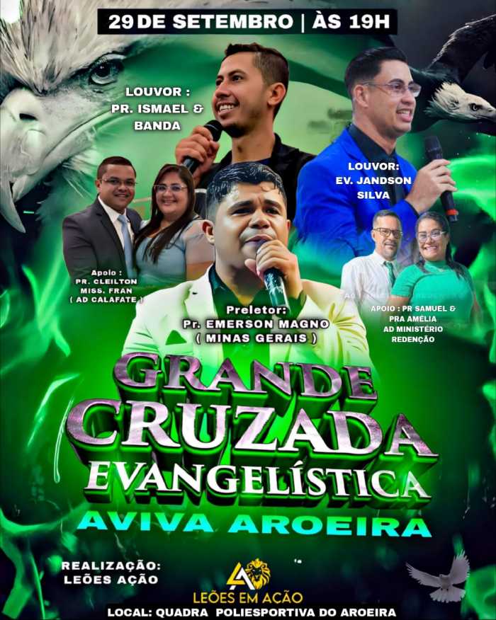 No próximo dia 29 de setembro, o Conjunto Aroeira, localizado no bairro Calafate, será palco de uma grande Cruzada Evangelística que promete impactar vidas com uma mensagem profética e momentos intensos de louvor e adoração. Organizado pelo grupo evangelístico "Os Leões em Ação,", o evento convida toda a comunidade a participar dessa celebração espiritual marcada pela comunhão e esperança.