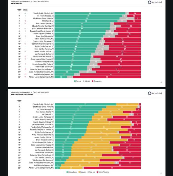 O ranking de aprovação é liderado por Eduardo Braide (São Luís, MA), com impressionantes 82% de aprovação, seguido por Dr. Furlan (Macapá, AP) com 78%, e Léo Moraes (Porto Velho, RO) com 75%. Esses prefeitos se destacam não apenas pela popularidade, mas também pela avaliação positiva de suas gestões: Braide, por exemplo, recebeu 72% de avaliações “ótimo/bom” em sua administração.
