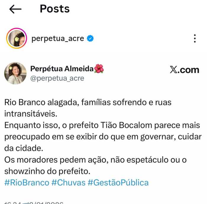 Em meio à calamidade, o prefeito Tião Bocalom (PL) passou a ser duramente criticado pela população e nas redes sociais, não apenas pela ausência de ações emergenciais efetivas, mas pela forma como reage publicamente a situações de crise. Mais uma vez, enquanto famílias enfrentavam prejuízos e o medo dentro de suas próprias casas, o gestor optou por publicar fotos em tom romântico e meloso ao lado da esposa, em total contraste com a gravidade do cenário vivido pela cidade. A postura de Bocalom atraiu críticas da ex-deputada federal Perpétua Almeida.