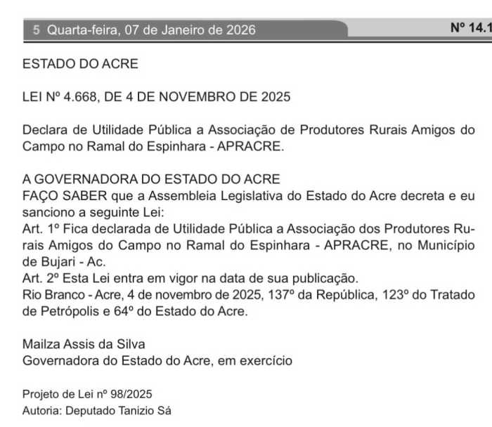 Foi publicada no Diário Oficial do Estado (DOE) do Acre, no dia 7 de janeiro, a Lei nº 4.668, de 4 de novembro de 2025, de autoria do deputado estadual Tanízio Sá (MDB), que declara de utilidade pública a Associação de Produtores Rurais Amigos do Campo no Ramal do Espinhara (APRACRE), localizada no município de Bujari. A norma foi aprovada pela Assembleia Legislativa do Acre e sancionada pela governadora em exercício, Mailza Assis da Silva, passando a ter validade legal em todo o território estadual.