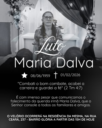 A filial Ginásio Coberto 1, da igreja Assembléia de Deus na Regional 2, que engloba as congregações em toda a Baixada da Sobral receberam com profundo pesar a notícia do falecimento da irmã Maria Dalva, ocorrido no dia 1º de fevereiro de 2026, aos 66 anos. Serva fiel, ela congregava na filial Ginásio Coberto 1, da rua 15, onde servia a Deus com dedicação ao Senhor, amor ao próximo e pela constância na obra de Deus. Sua partida deixa um sentimento de tristeza em toda a congregação, mas também de gratidão pela vida que foi entregue ao serviço cristão.